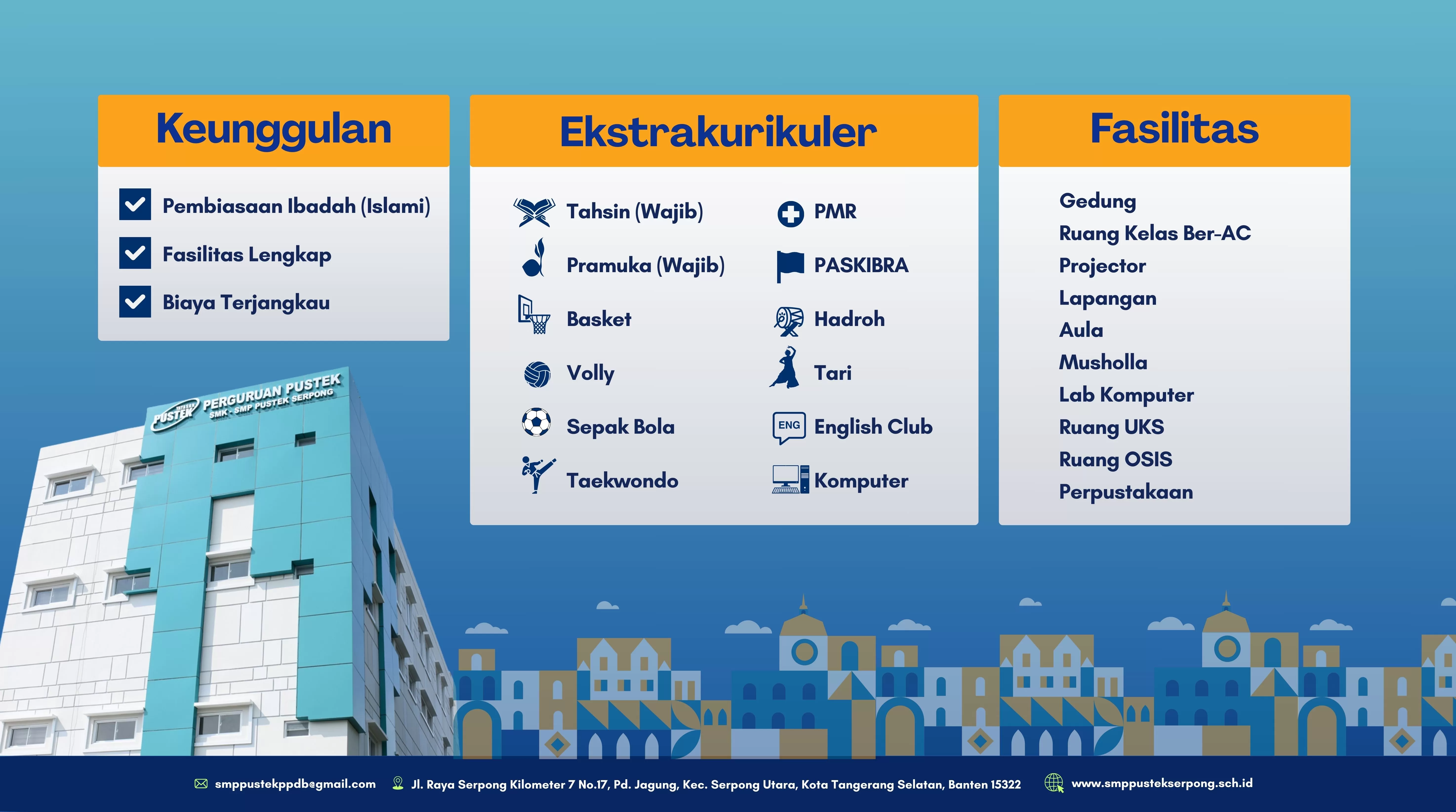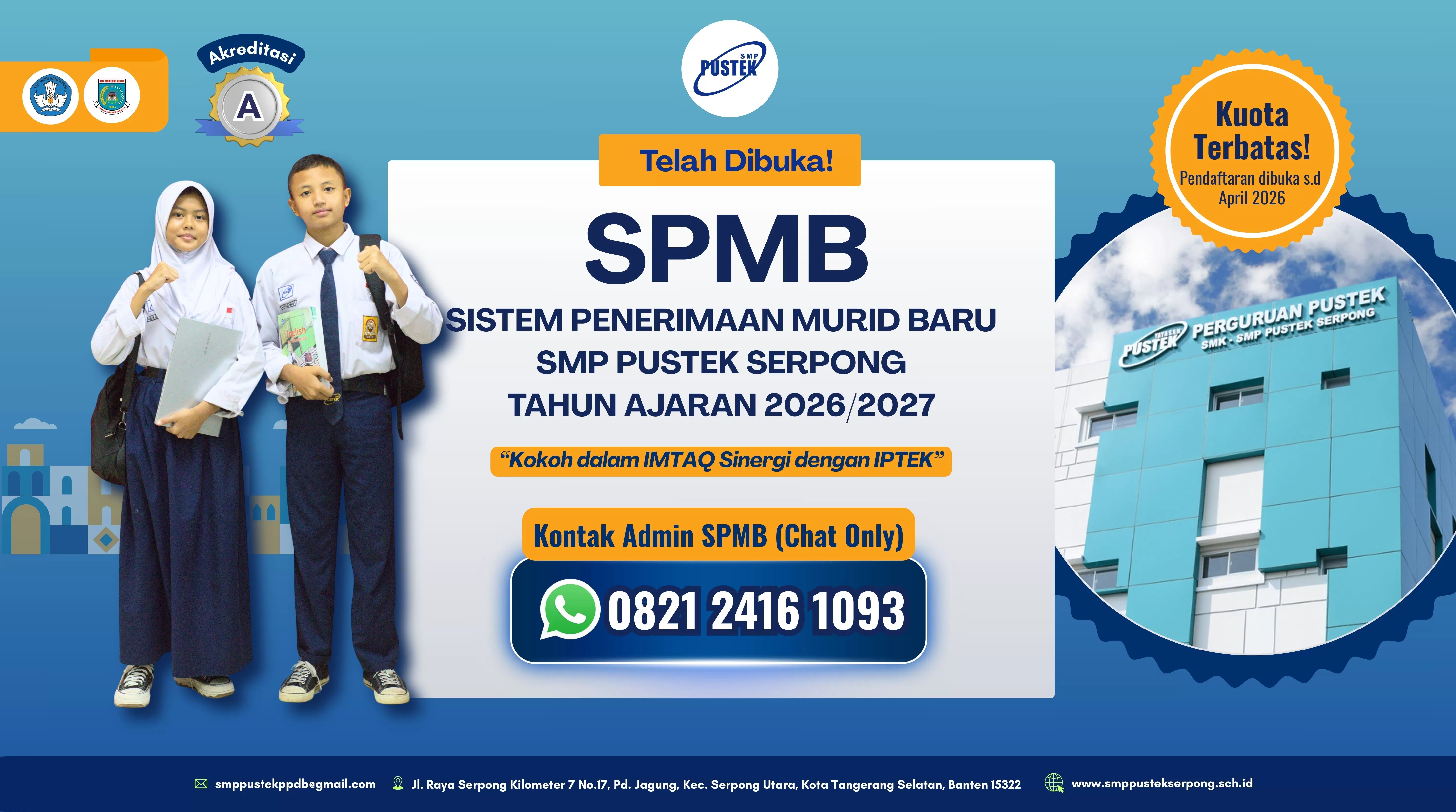 Puji syukur kepada Allah SWT, Tuhan Yang Maha Esa yang telah memberikan rahmat dan anugerahNya sehingga website SMP PUSTEK Serpong ini dapat terbit. Kami sadar sepenuhnya dalam rangka memajukan pendidikan di era berkembangnya Teknologi Informasi yang begitu pesat, sangat diperlukan berbagai sarana prasarana yang kondusif, kebutuhan berbagai informasi siswa, guru, orangtua maupun masyarakat, sehingga kami berusaha mewujudkan hal tersebut semaksimal mungkin. Semoga dengan adanya website ini dapat membantu dan bermanfaat, terutama informasi yang berhubungan dengan pendidikan, ilmu pengetahuan dan informasi seputar SMP PUSTEK Serpong. Terima kasih atas kerjasamanya, maju terus untuk mencapai SMP PUSTEK Serpong yang lebih baik lagi.